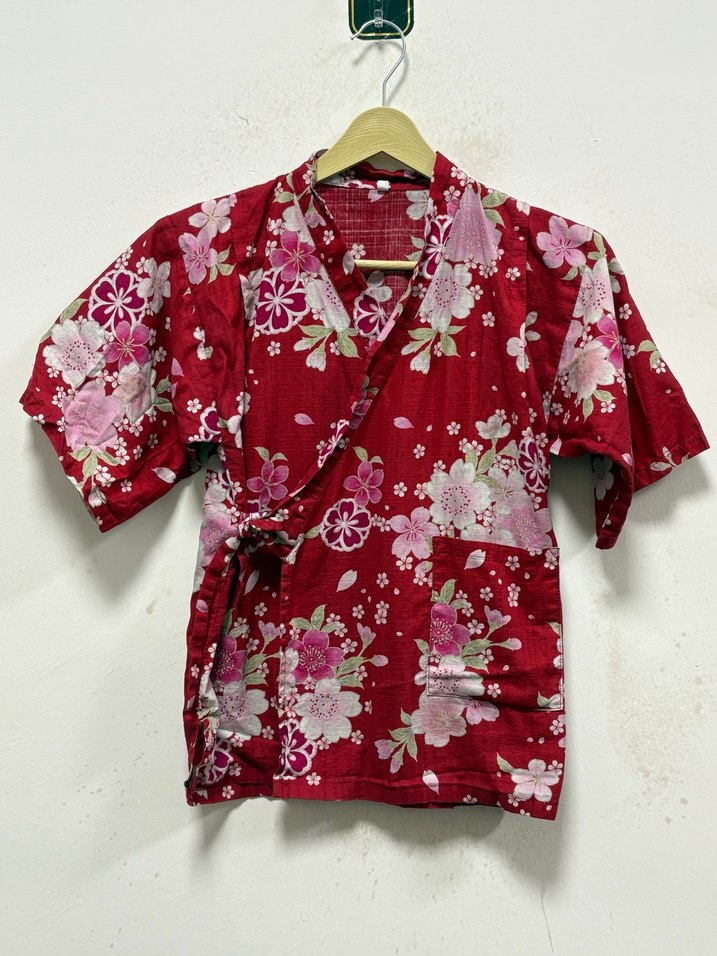 Renkli çiçek desenli, kısa kollu, V yakalı kadın kimono. Düğmeli, bol kesim ve günlük kullanıma uygun kırmızı kumaştan yapılmıştır.