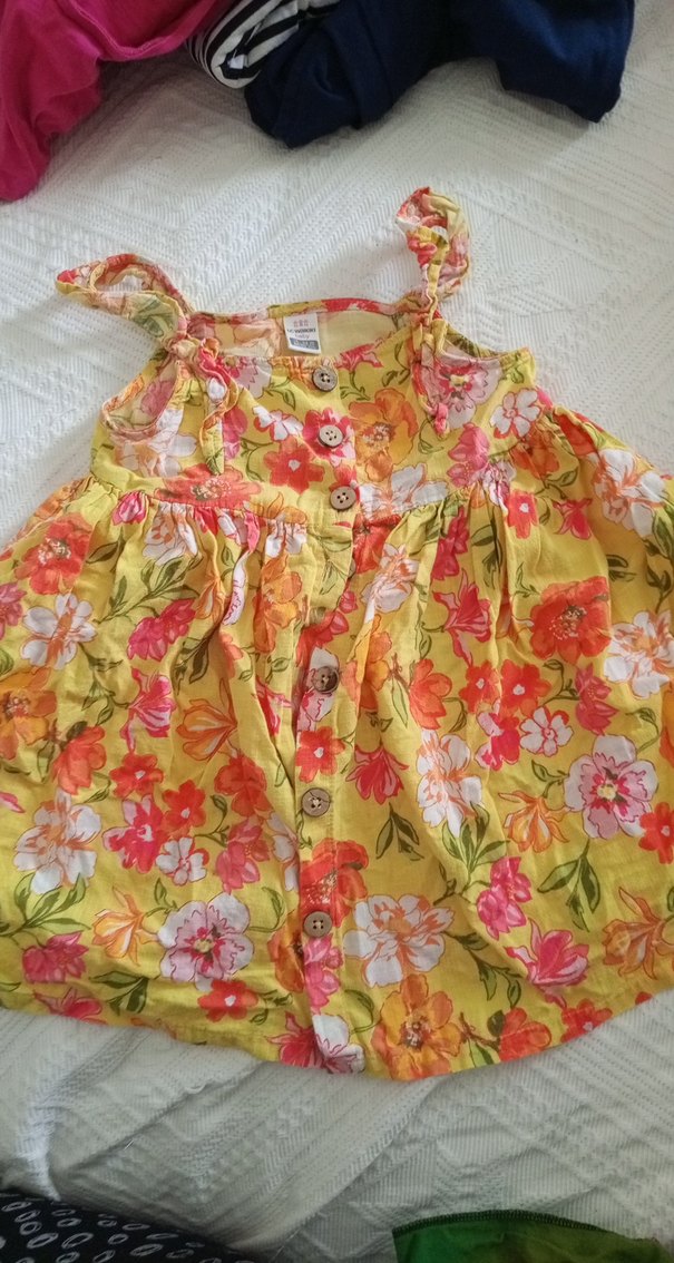Renkli çiçek desenli, askısız ve düğmeli önü olan bol kesim kız elbisesi. Sentetik kumaştan, bohem tarzda bir tasarım.