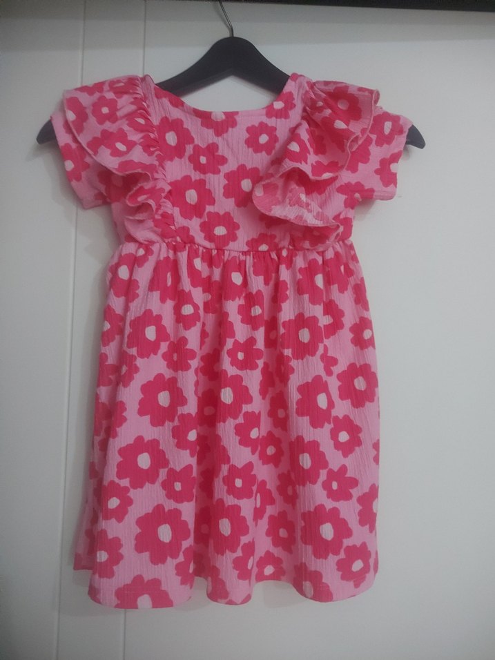 Renkli çiçek desenli, kolsuz, volanlı ve bol kesim kız elbisesi. Bohem tarzda şık ve rahat bir model.