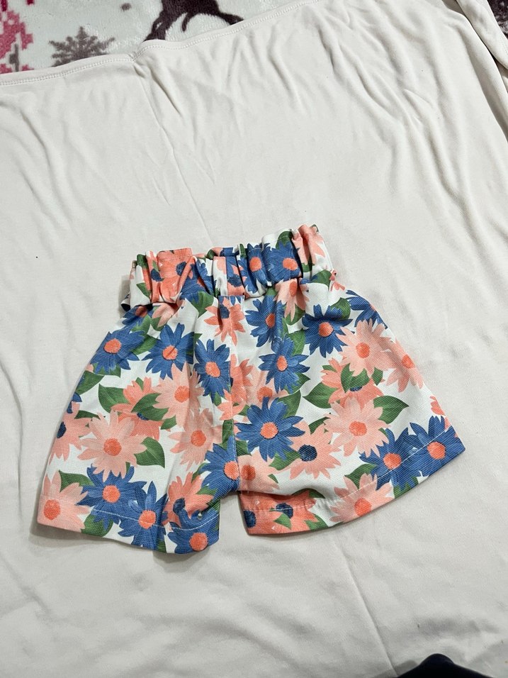 Renkli çiçek desenli, bol kesim kız şortu, fırfırlı ve yumuşak sentetik kumaştan, bohem tarzı için uygun.