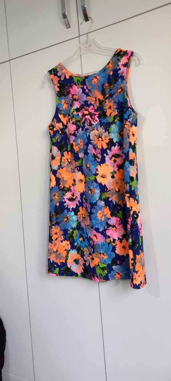 Kolsuz, renkli çiçek desenli ve pileli kız elbisesi. Bol kesim ve askısız yaka ile bohem tarzını yansıtıyor.