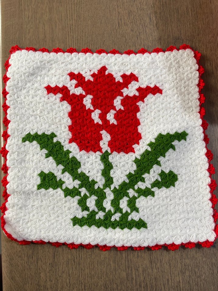 Kırmızı, beyaz ve yeşil iplikten yapılmış, çiçek desenli renkli lif. Nazikçe peeling yapan dokulu örgü ile el işi.