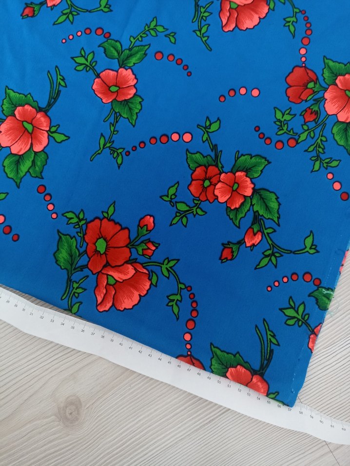 Mavi zemin üzerine renkli çiçek desenleriyle süslenmiş, geleneksel ve canlı görünümlü masa örtüsüdür.
