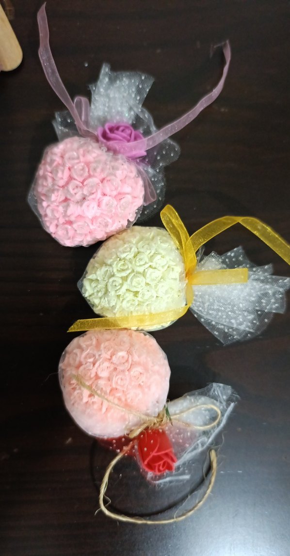 Çiçek demeti şeklinde renkli dolap süsü, dekoratif kurdele ve tül ile sarılı. . adet fiyatı 100 tl