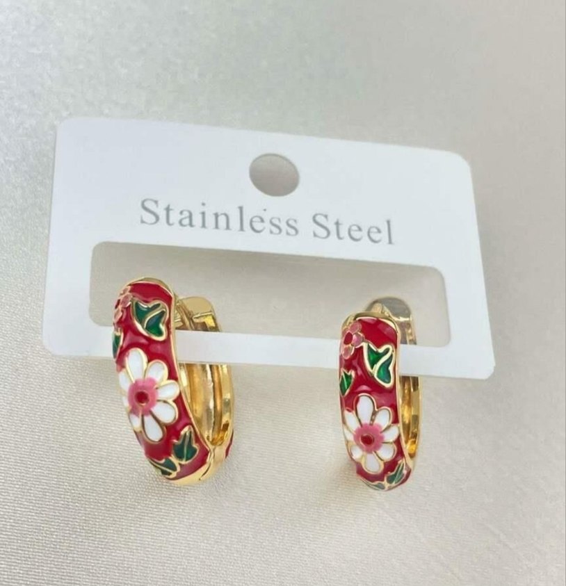 Renkli çiçek desenleri ve tokalı tasarımı olan kısa altın kaplama küpeler. Paslanmaz çelikten üretilmiş, bohem tarzına uygun.