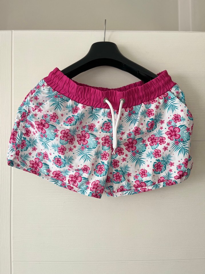 Renkli çiçek desenli, mini şort, pembe bel bandı, plaj ve normal giyim için uygun. Cepli, astarsız
