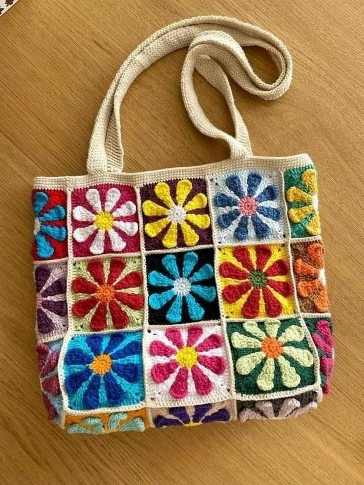 Renkli çiçek desenleriyle süslenmiş, yumuşak örgü kumaştan yapılmış bohem tarzda günlük kullanıma uygun çanta.