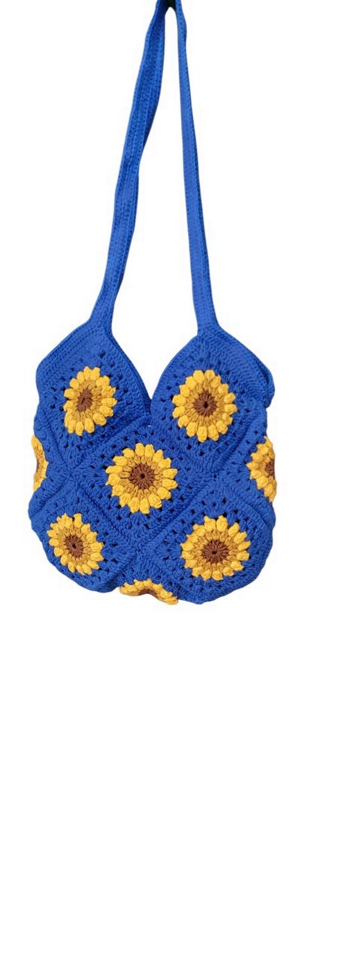 Renkli çiçek desenleriyle örülmüş, bohem tarzda mavi ve sarı renkli kadın çantası. Günlük kullanım için retro ve hippie havası sunar.