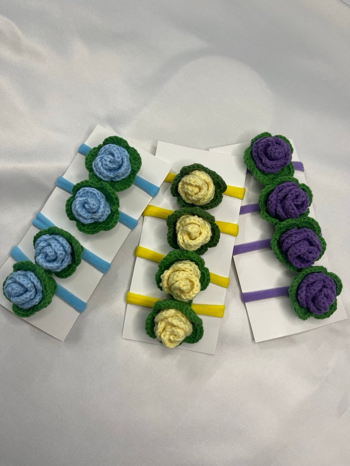 Çocuklar için renkli, çiçek desenli örgü saç tokası seti. Mavi, sarı ve mor tonlarında birden fazla toka içerir. İlan bir çift lastik toka fiyatıdır