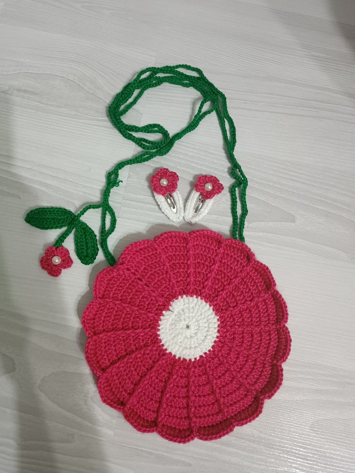 Renkli örgü malzemeden yapılmış, yuvarlak çiçek deseni kız çantası ve uyumlu toka seti, yeşil örme askılarla bohem tarzı yansıtıyor.