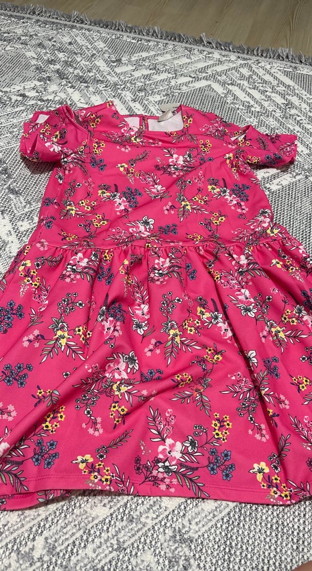 Pembe renkli, çiçek desenli kız elbisesi, salaş kesim ve kısa fırfırlı kollara sahiptir. Yuvarlak yakalı, bohem tarzda renkli bir tasarımdır.