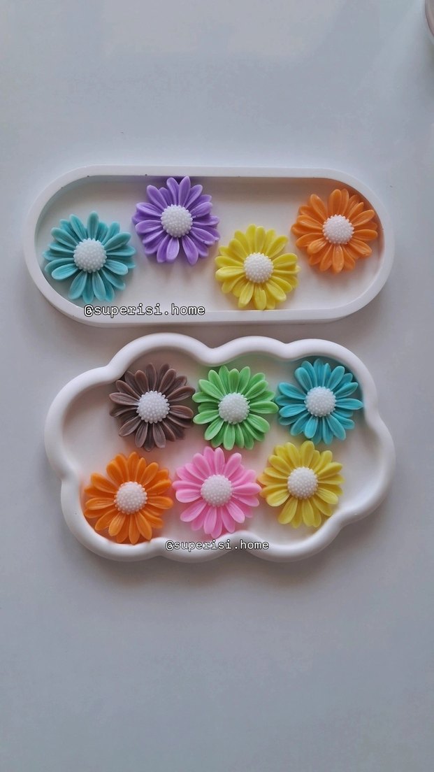 Canlı renklerde çeşitli çiçek şeklinde mum ve sabunlar yapılır görseldeki ürünler kokulu bitkisel sabundur.İsteğe göre renk koku yapılır Tanesi 50 tldir