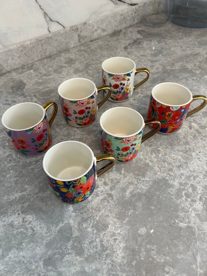 Renkli çiçek desenleriyle süslenmiş seramik fincanlardan oluşan set, içecekleriniz için neşeli bir dokunuş sağlar.