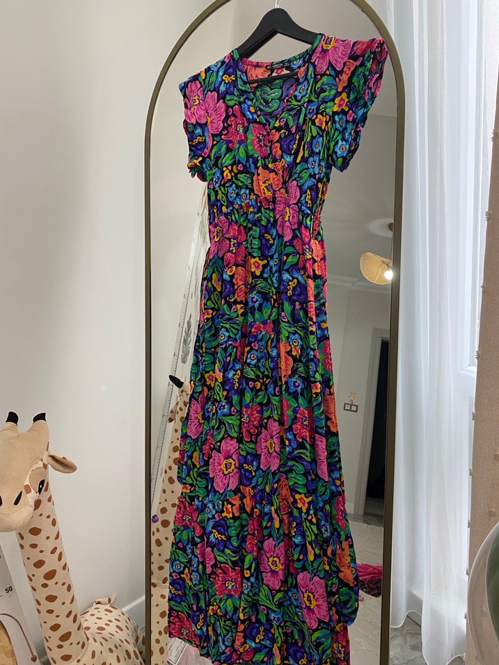 Renkli çiçek desenli, bol kesim uzun elbise. Askılı ve fırfırlı detaylara sahip, V yaka tasarımıyla günlük kullanıma uygundur.