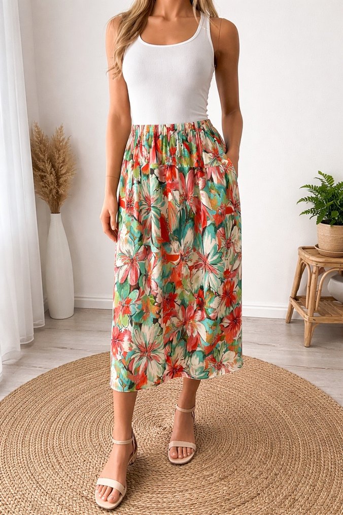 Renkli çiçek desenli uzun bohem etek, bol kesim, pileli detaylı ve yumuşak sentetik kumaştan üretilmiştir.