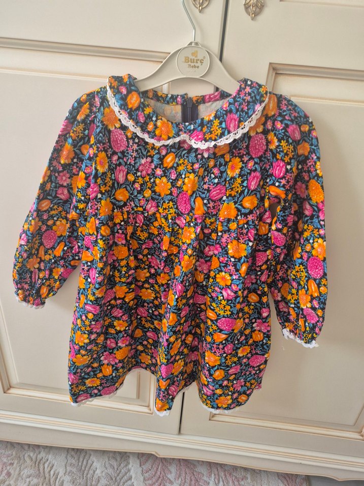 Uzun kollu, bol kesim ve yakalı, fırfırlı detaylı renkli çiçek desenli bohem tarzda kız elbisesi. Hiç bir sıkıntısı yok fermuarı çalışıyor