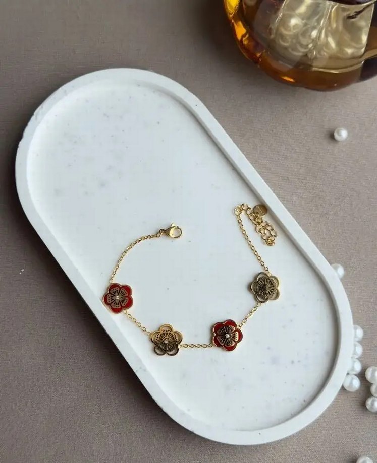 Altın renkli zincir bileklik, renkli çiçek desenleriyle minimal ve bohem tarzı klasik şıklıkla buluşturuyor. Günlük kullanıma uygun.