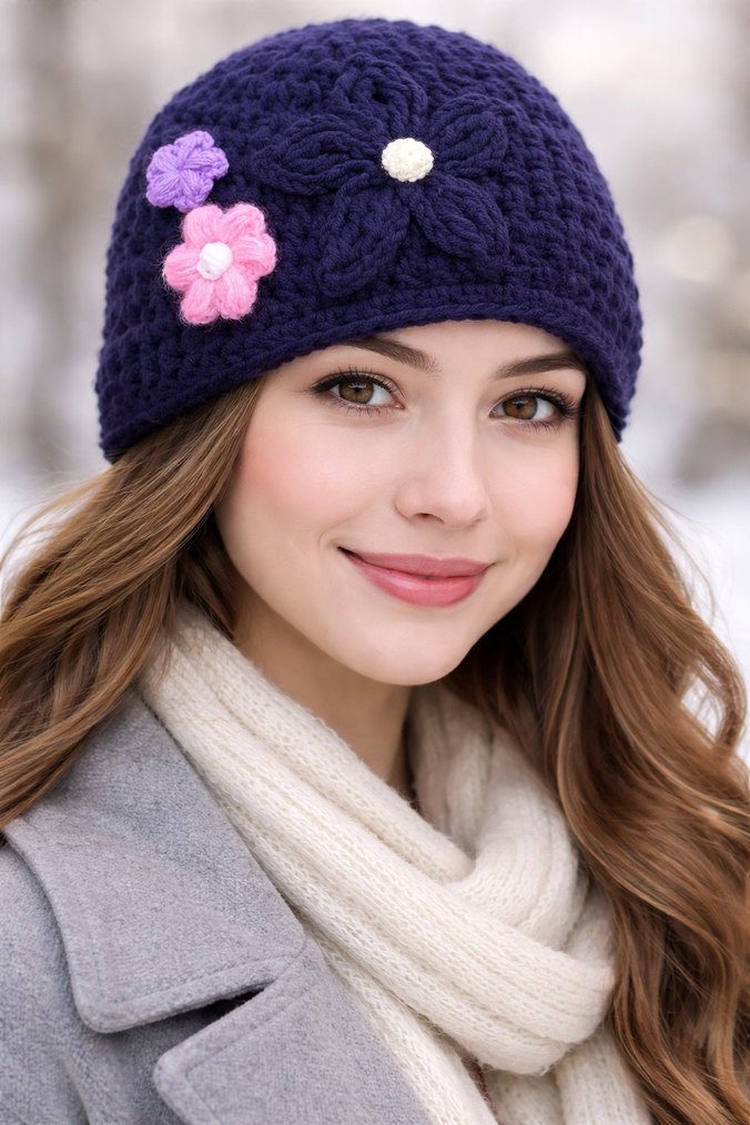Mor renkli, örgü yapıda bere, renkli çiçek detaylarıyla süslenmiştir. Sıcak tutar ve rahat günlük kombinlere uygundur. ❄️