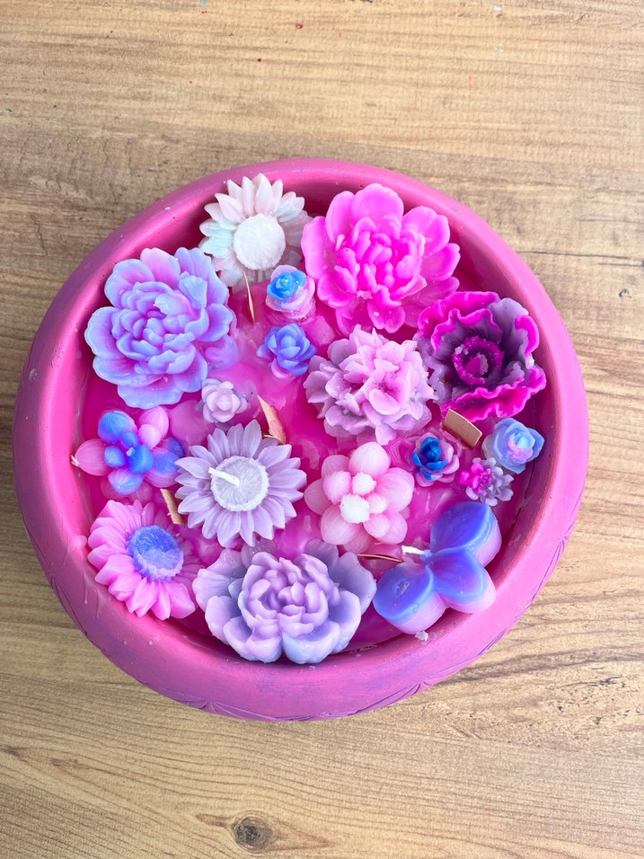 Çeşitli çiçek şeklinde detaylarla süslenmiş, pembe, mor ve mavi tonlarında renkli bir mum. ️