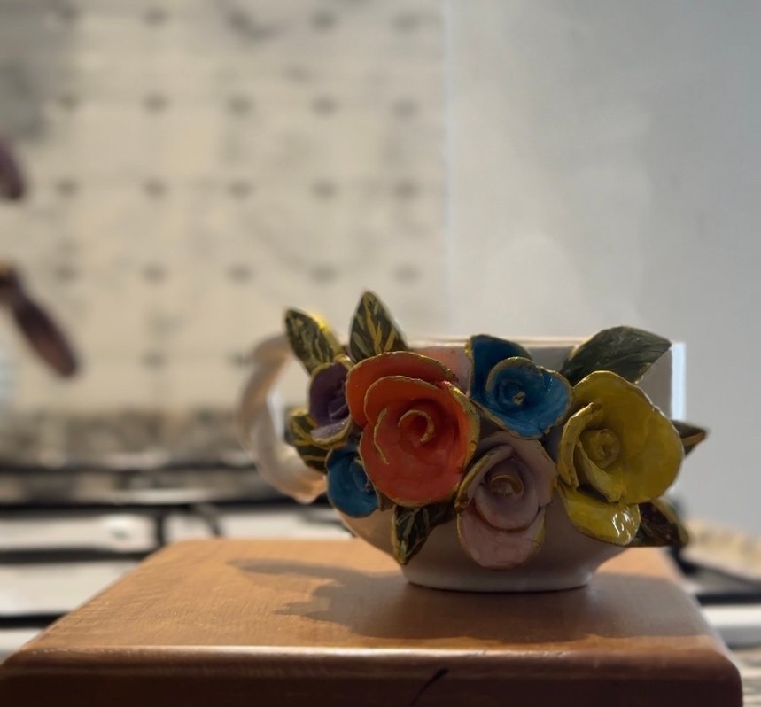Seramik kupa, renkli üç boyutlu çiçek detaylarıyla canlı bir görünüm sunar. El yapımıdır, fırınlanmış el emeğim❣️
