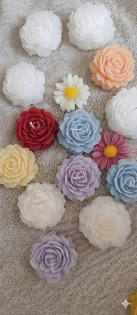 Yumuşak ve açık tonlarda zarif yaprak detaylı, renkli çiçek şeklinde mum seti. Dekoratif kullanım için uygundur. 1 adet fiyatıdır çoklu alım da indirim onun için ilan açabilirsiniz