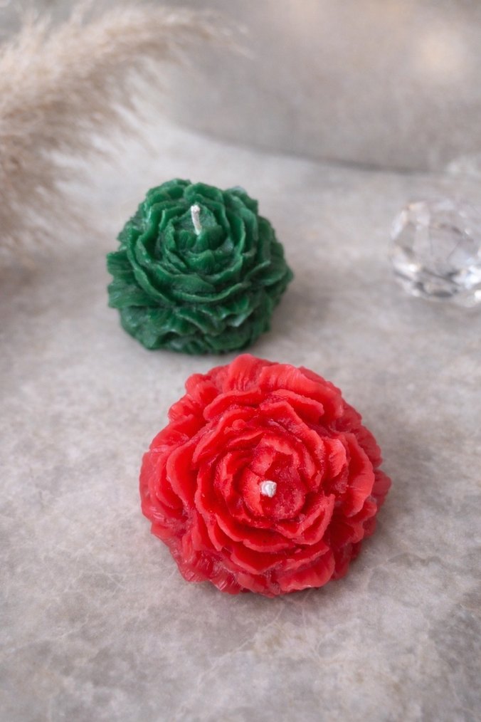 Kırmızı ve yeşil renklerde, çiçek şeklinde detaylı yaprak tasarımlı renkli mumlar.