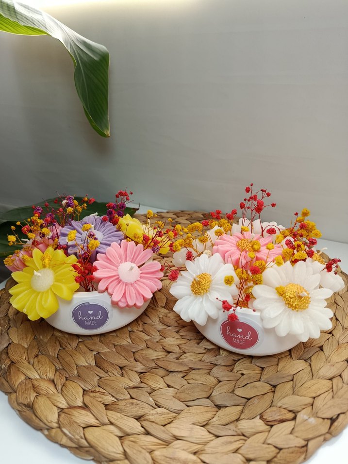 Renkli papatya buketi şeklinde dekoratif mumlar, küçük kurutulmuş çiçeklerle yuvarlak taş tozu kaselerde düzenlenmiştir. isteğe özel renk ve kokuda üretilebilmektedir sipariş için iletişime geçin