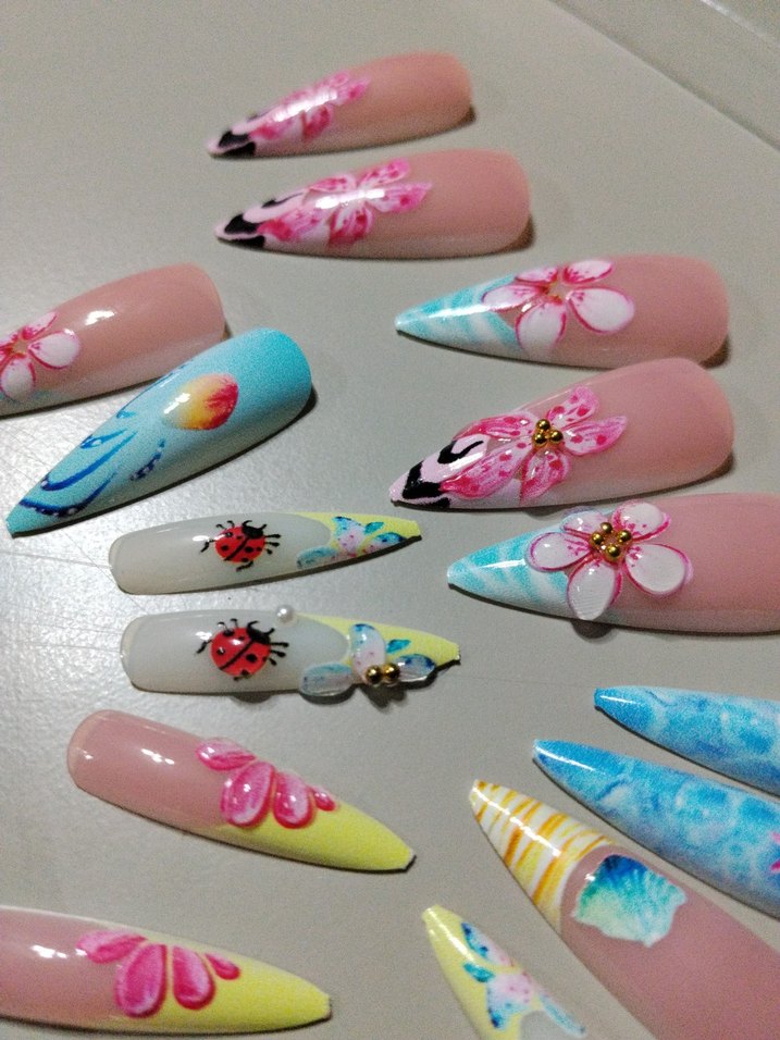 Canlı detaylarla çiçek ve böcek desenli renkli tırnak süslemeleri, yaratıcı tırnak sanatları için idealdir.