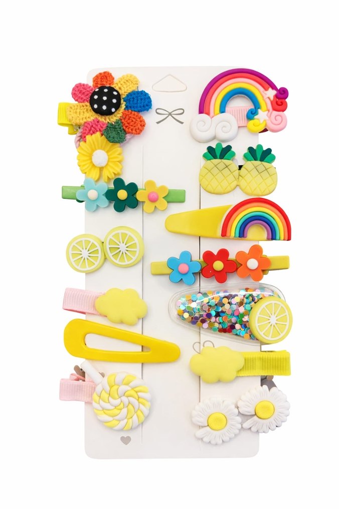Renkli çiçek, gökkuşağı ve meyve desenli, boncuk detaylı çocuk saç tokaları. Bohem ve retro tarzına uygun eğlenceli tasarımlar.
