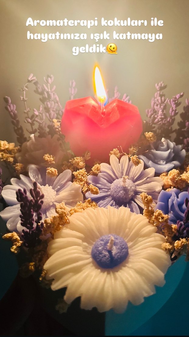 Renkli çiçek şeklinde mumlar ve ortada kırmızı kalp mum, çevresinde narin kuru çiçekler bulunur. Sıcak ve dekoratif bir ortam sağlar. ️