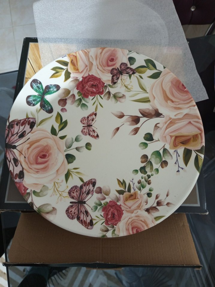 6 tane Yuvarlak bej tabak, açık pembe güller ve kelebeklerle süslenmiş, zarif bir çiçek deseni sunar. Masanıza doğallık katmak için ideal. Hic kullanmadim hediye gelmişti fazlalik olduğu icin satıyorum
