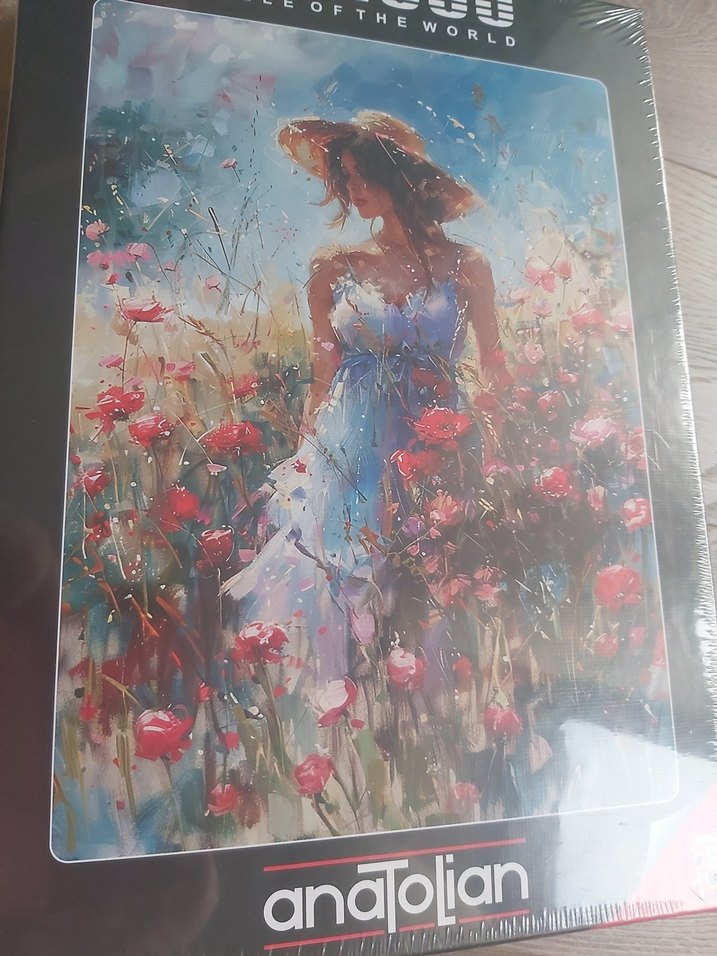 Renkli çiçekler arasında açık renk elbise giymiş bir kadını gösteren detaylı ve canlı bir puzzle. Anatolian markalıdır. Ambalaji açılmamış harika bir yapboz. Internette farklı fiyatlarda satılık olarak var kimi yerde 1000 lira kimisinde 725 lira.