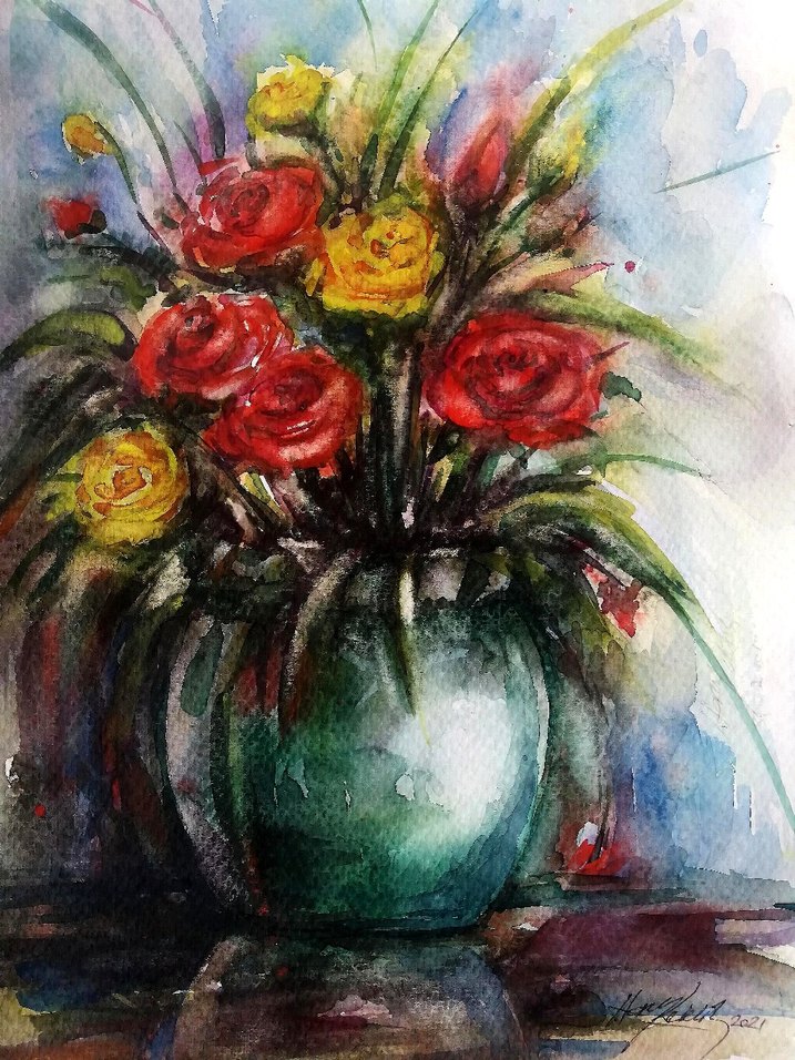 Renkli Çiçekler ve Vazo Sulu Boya Tablo