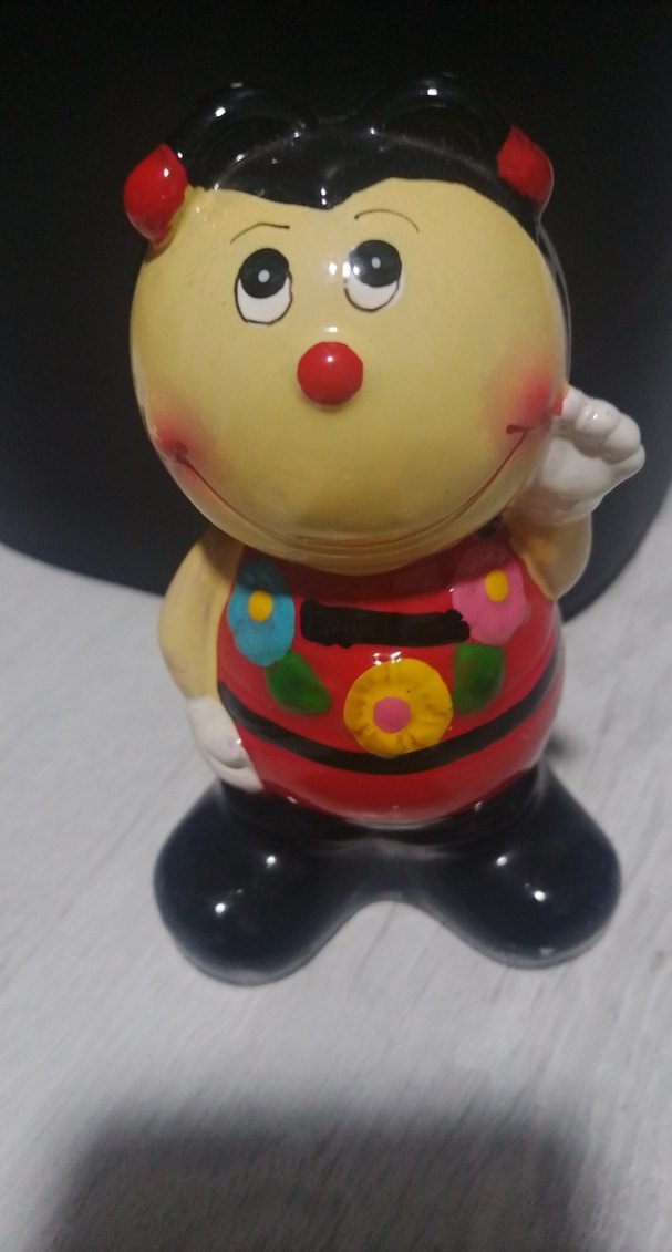Çiçek detaylı, kırmızı, sarı ve siyah renkli neşeli arı figürü.