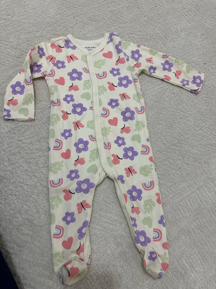 Pastel çok renkli bebek tulumu, mor çiçekler, kalpler ve gökkuşakları desenli. Uzun kollu ve düğmeli yapısıyla kolay giyilir.