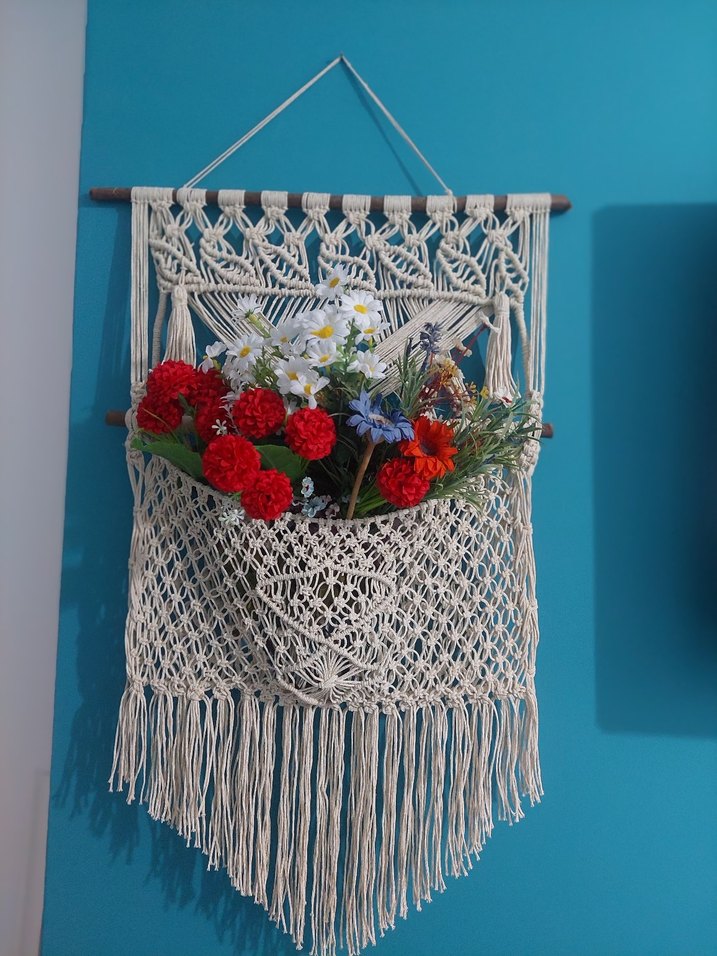 Beyaz makrome duvar süsü, içinde renkli yapay çiçekler bulunan örme bir cep ile odanıza canlılık katıyor.