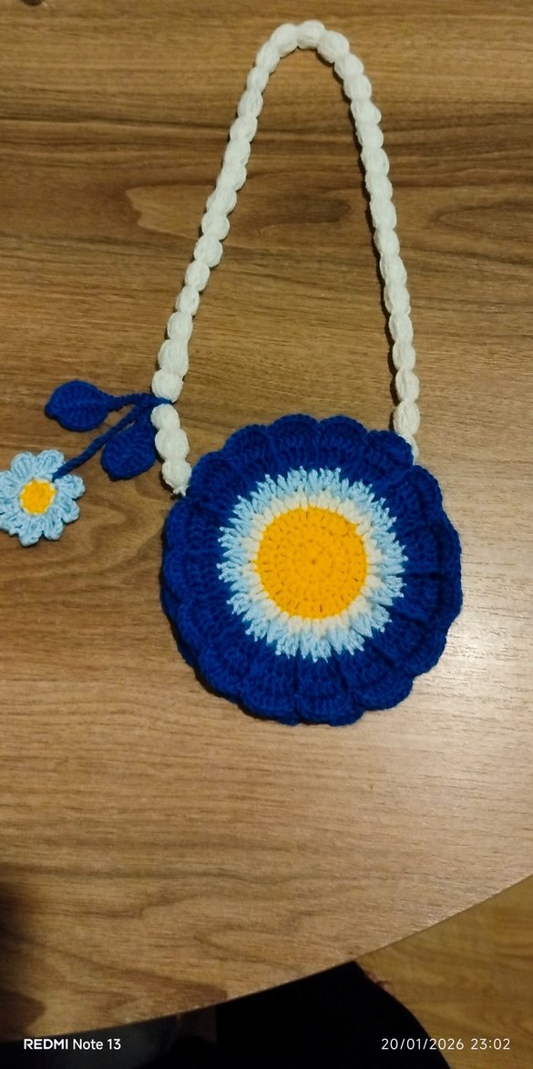 Bu bohem tarz çanta, mavi, beyaz ve sarı renklerde çiçek desenlerine sahiptir. El yapımı askısı ve küçük çiçek süsü bulunur.