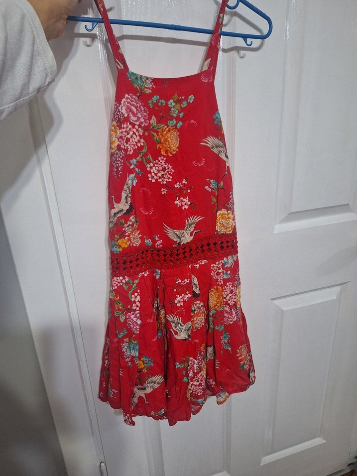Renkli çiçek ve kuş desenli, straplez yaka, bol kesim ve fırfırlı bohem midi tulum. Yumuşak kumaştan, romantik akşamlar için ideal. Askılarla beraber 80 cm boy
