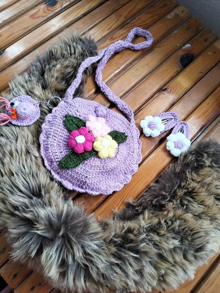 Mor renkte, renkli çiçek desenli, bohem tarzda örme çanta ve çiçekli uyumlu aksesuarlar içerir.