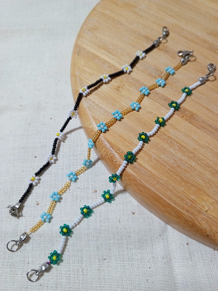 Çiçek desenli, renkli boncuklardan oluşan bohem tarzda bileklikler. Günlük kullanım için uygun, canlı renklerle küçük çiçek detayları içerir. Ayarlama zinciri eklenecektir.