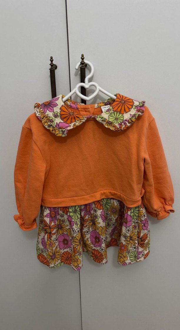 Uzun kollu, renkli çiçek desenli, fırfırlı yakalı ve bol kesim bohem tarzda kız elbisesi, canlı turuncu renkli.