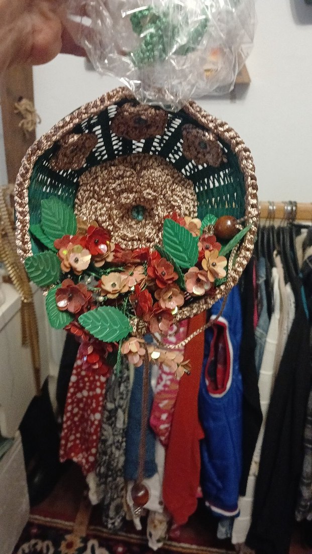 Canlı çiçekler ve yeşil yapraklarla süslenmiş renkli hasır duvar süsü, mekana doğal bir hava katar.