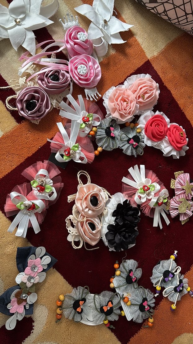 Renkli çiçek desenli, kurdele detaylı çocuk saç aksesuarları, bohem tarzıyla trend ve özgün görünümler için uygun.