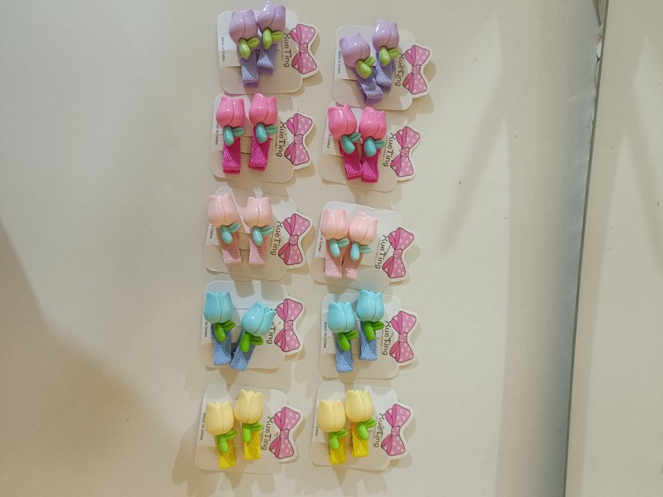 Çeşitli pastel tonlarda, çiçek deseni ve kurdele detaylı renkli çocuk tokaları seti.