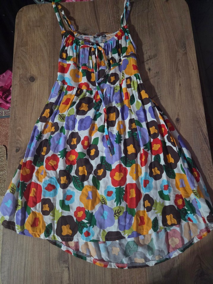Renkli çiçek desenli, bol kesim midi elbise Yumuşak dokulu kumaştan, fırfır detaylı bohem tarzda.