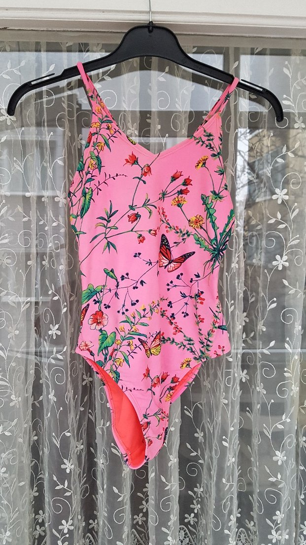 Renkli çiçek ve kelebek desenleri, ince askılar ve dantel detaylarıyla pembe, kısa ve vücuda oturan kadın mayo.
