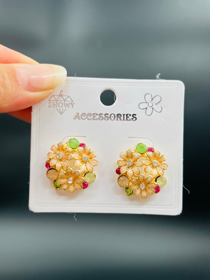 Çiçek desenli ve payet detaylı renkli mini küpeler, bohem ve göz alıcı tarzda, düğünler için uygun.