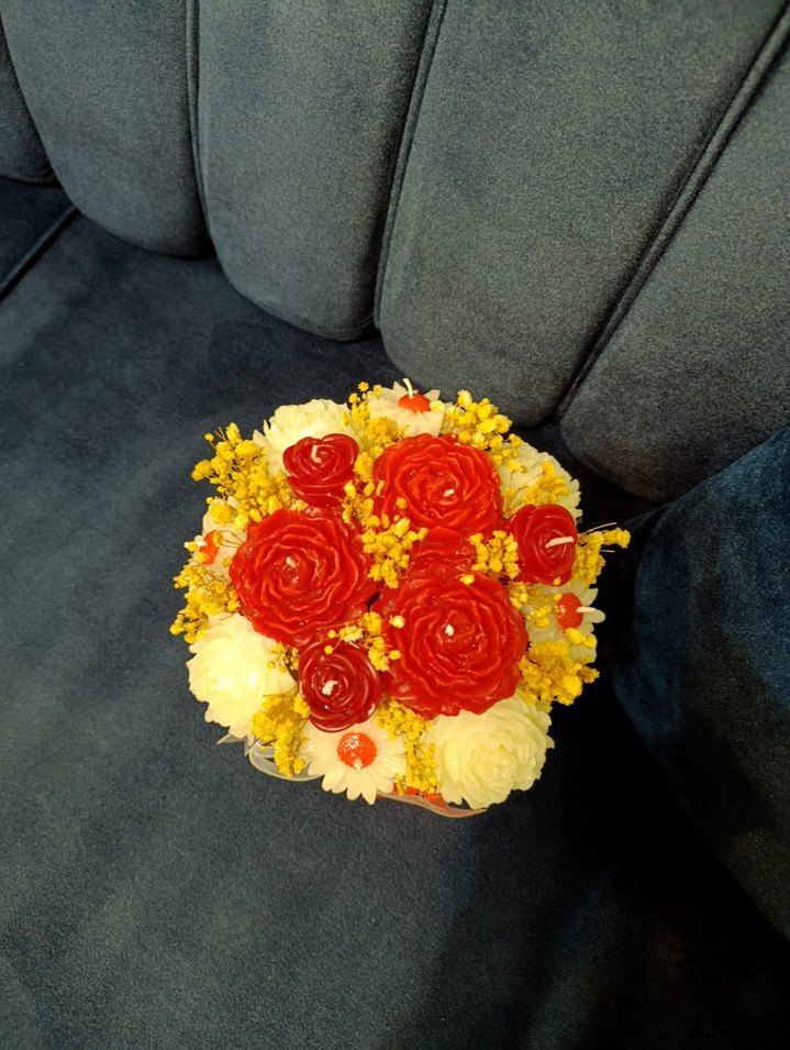 Kırmızı ve beyaz çiçek tasarımlı, sarı detaylı renkli mum aranjmanı, ortama canlılık katmak için ideal. ️