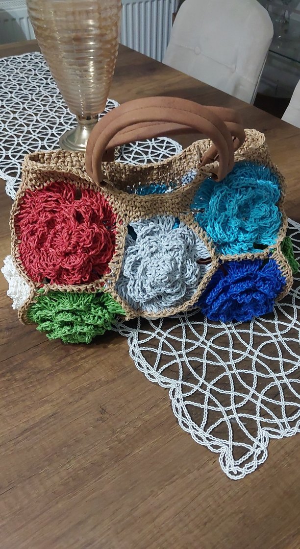 Renkli çiçek desenleri ve dantel detaylarıyla bohem tarzı örgü kadın çantası, yumuşak saplarıyla konfor sağlar.