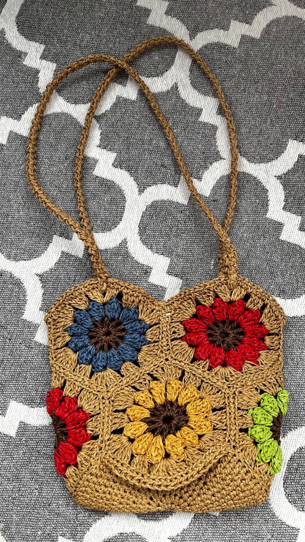 Bu kadın çantası, renkli örgü çiçek deseni ve bohem tarzıyla dikkat çeker. Uzun askılı ve minik olmasına rağmen geniştir , günlük kullanıma uygundur.